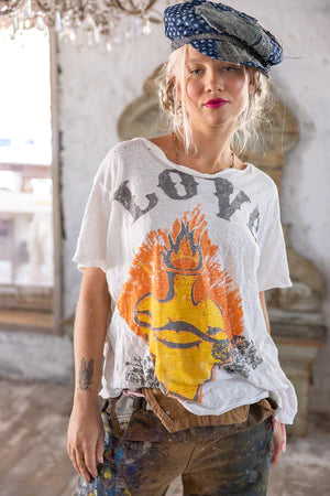 - Hand-Distressing (Small Holes) at Neckline, Shoulders & Hems